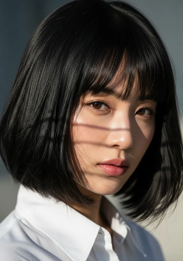 I’m obsessed with how bold and confident this hairstyle feels. The blunt bangs are daring and strong, while the smooth bob keeps everything balanced and fresh. It’s a great look for those who like to make a statement with their hair.