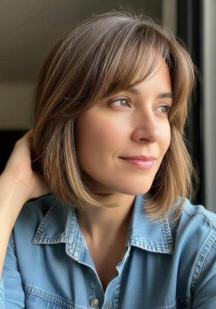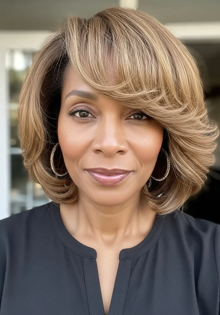 This is the kind of bob that works for almost any occasion. The layers make it low-maintenance yet still stylish, and the side-swept bangs soften the face, making it look youthful and fresh. It’s the perfect mix of casual and polished—ideal for someone who’s always on the go but loves to look put-together!