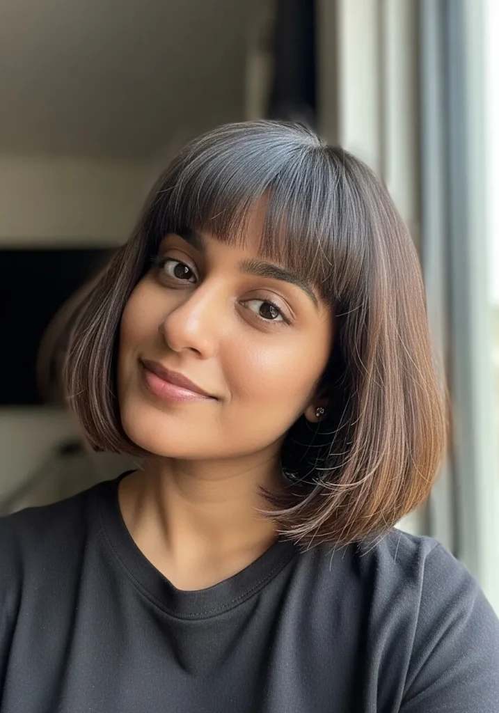 I adore how this style is both bold and elegant. The blunt bangs make a statement, while the smooth bob keeps everything looking fresh and polished. It’s an ideal choice for someone who wants to make a statement without going overboard.