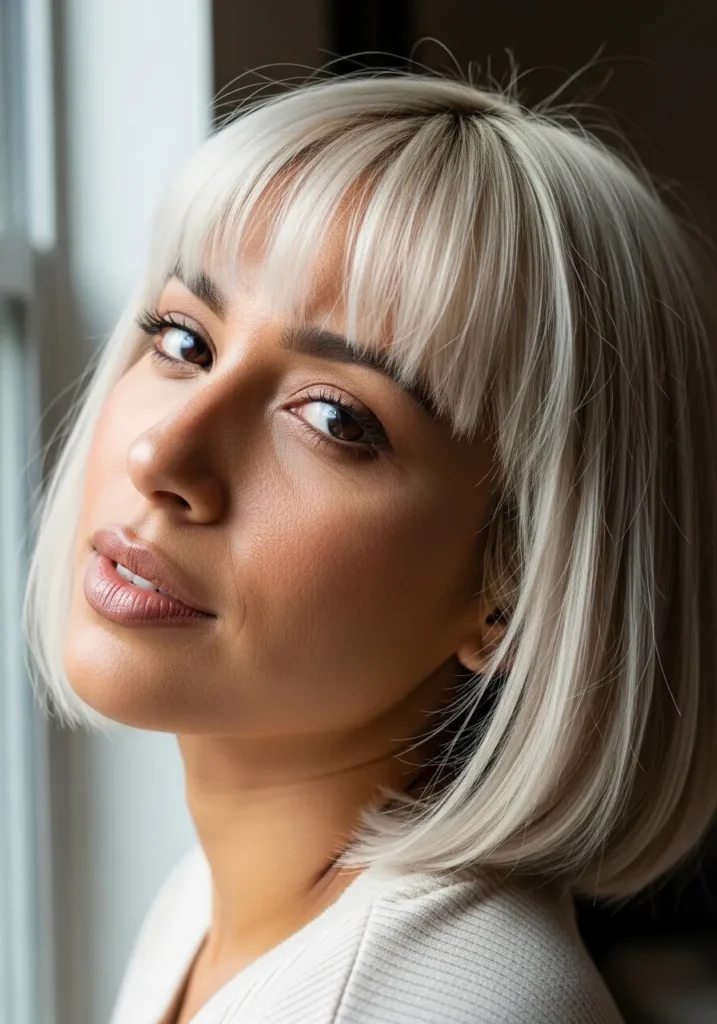 A stunning platinum blonde bob with super straight baby bangs that sit just above the eyebrows. The hair is sleek, shiny, and perfectly cut at chin length, creating a clean, modern look. The light blonde shade gives off an icy vibe that’s both bold and striking.