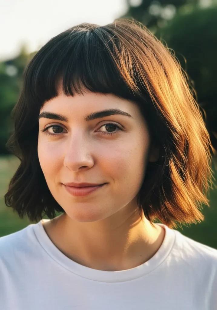 A beautifully sleek bob with bold, straight bangs that perfectly frame the face. The light brown hair is styled to a smooth, glossy finish, and natural sunlight adds a golden glow to the overall look.