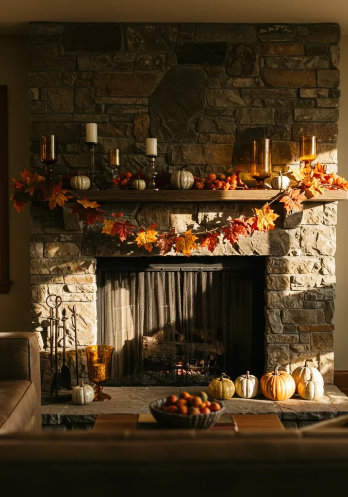 A rugged stone fireplace gets an inviting seasonal update with garlands of fiery leaves, clusters of pumpkins, and amber glass candleholders adding a soft glow. The natural textures of stone and wood balance beautifully with the warm autumn tones.