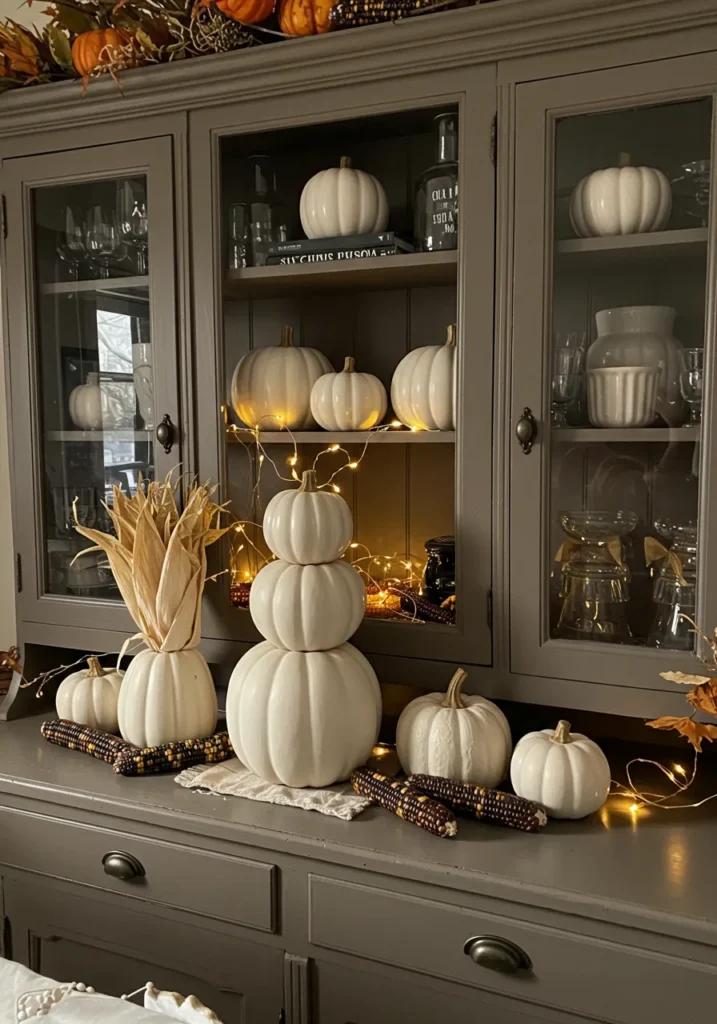 This farmhouse hutch is filled with white pumpkins styled on shelves and countertops, mixed with fairy lights, dried corn, and a whimsical stacked pumpkin tower. The soft glow of the lights highlights the neutral tones perfectly.