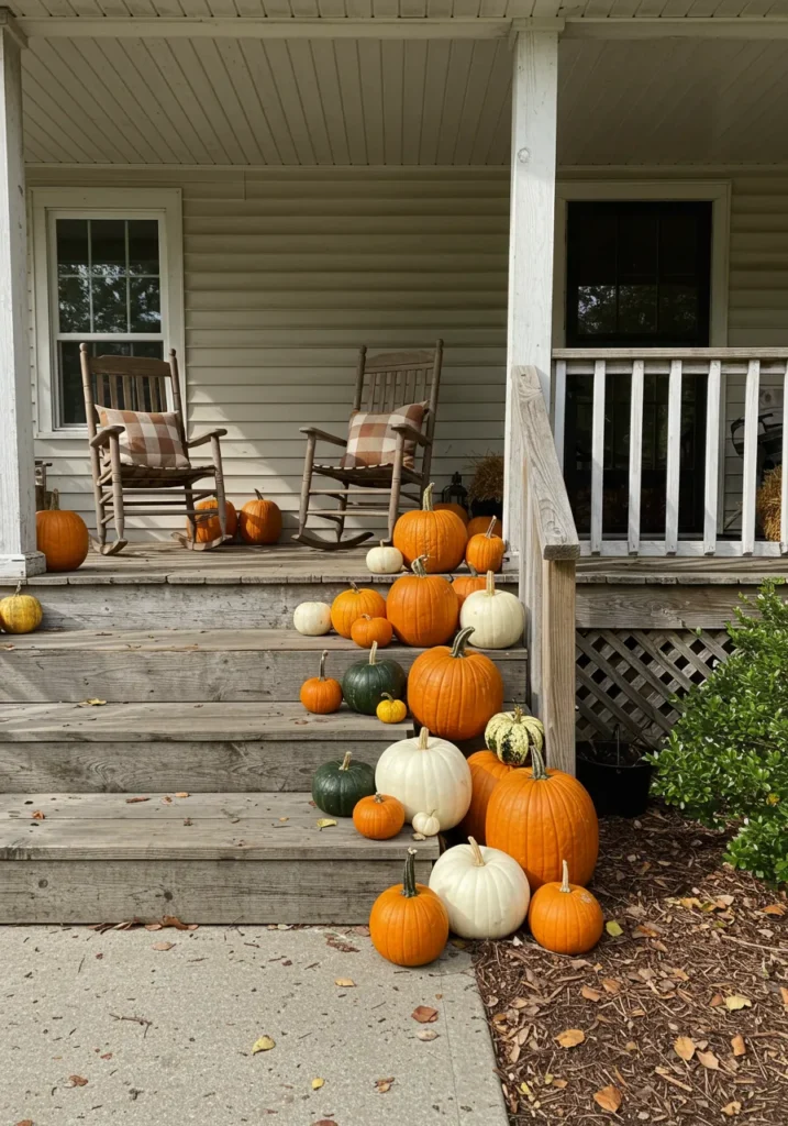 Wooden porch steps are decorated with an assortment of pumpkins in orange, white, and deep green tones, casually stacked in groups along the edges. Rocking chairs with plaid pillows complete the scene.