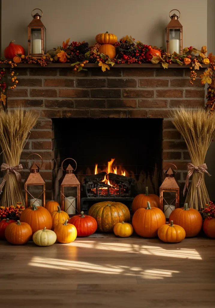 A brick fireplace glows with a roaring fire, surrounded by copper lanterns, bundles of wheat, and a garland of berries and leaves across the mantle. A generous collection of pumpkins in all sizes completes the look.