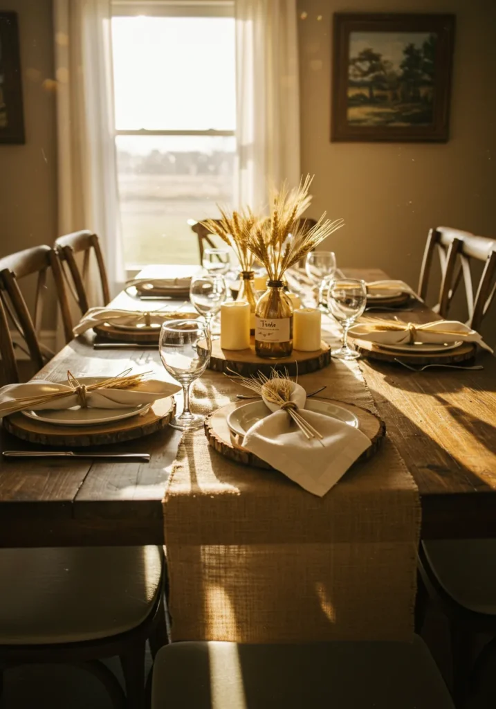 This dining table is styled with rustic wood chargers, soft linen napkins, and bundles of wheat tied neatly at each place setting. A centerpiece of golden wheat in amber glass bottles and glowing candles adds height and warmth under the natural afternoon light.