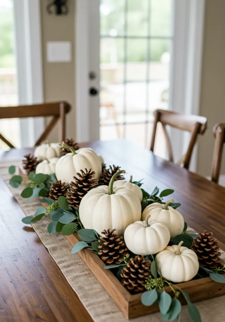 This dining table centerpiece is styled with creamy white pumpkins, pinecones, and fresh eucalyptus layered in a wooden tray. The mix of natural textures keeps it balanced and fresh while still feeling festive.