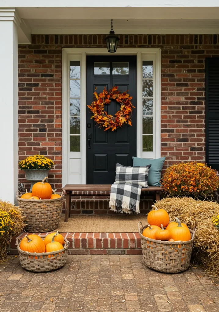 A classic brick porch comes alive with baskets of bright pumpkins, golden mums, and a leafy autumn wreath on the black front door. A plaid throw draped over a bench makes the space look cozy and ready for guests.