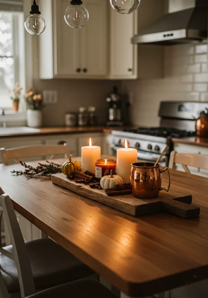 This kitchen table display feels perfectly intimate with glowing candles, a copper mug, cinnamon sticks, and tiny pumpkins styled on a rustic wooden board. The mix of textures creates a warm, aromatic atmosphere.