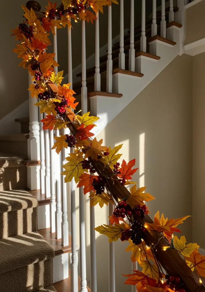 The staircase banister is dressed with vibrant garlands of orange and yellow leaves, dotted with faux berries and twinkle lights. The sunlight catches the colors, making them pop against the white spindles.