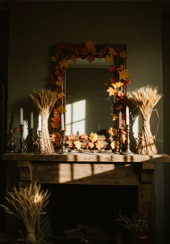 This mantel design brings together the charm of natural wheat bundles tied neatly with twine, tall candlesticks in vintage holders, and a simple autumn garland draped around a framed mirror. The wood’s worn texture paired with warm sunlight makes the entire space feel earthy and timeless.
