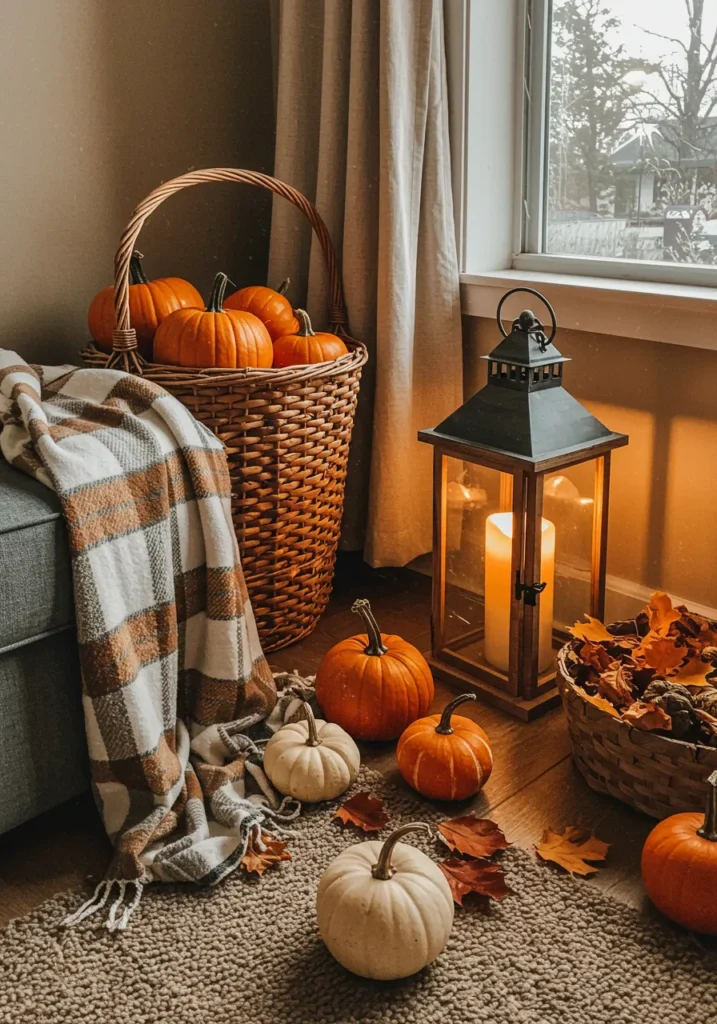 A large woven basket filled with pumpkins, a soft plaid throw, and a lantern glowing with candlelight create a snug little corner near the window. Scattered leaves and smaller pumpkins bring extra charm to the scene.