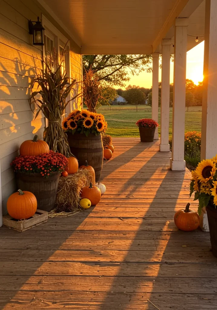 This golden-hour porch setup just radiates fall happiness. Wooden barrels hold bright sunflowers and mums surrounded by pumpkins of all shapes and sizes. The warm sunset glow gives everything a magical, nostalgic touch that makes the whole porch feel alive.
