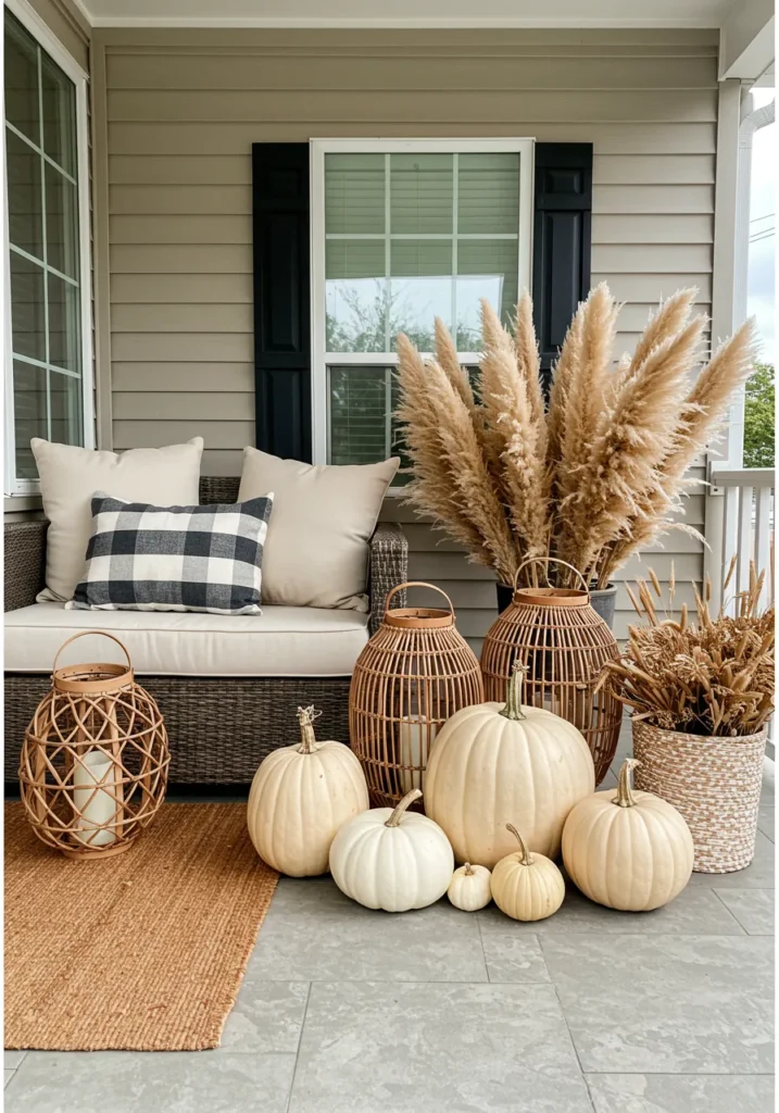 This design nails that modern farmhouse aesthetic. The creamy pumpkins blend beautifully with the wicker lanterns, pampas grass, and neutral cushions. The textures work together so effortlessly that the whole scene feels cozy but refined.