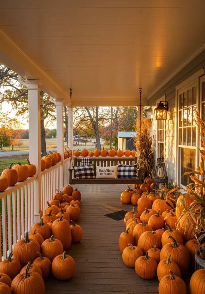 This wraparound porch is the definition of festive abundance. Every inch is lined with bright orange pumpkins, and the black-and-white plaid pillows add that perfect farmhouse touch. The warm sunset glow makes it all feel cheerful, cozy, and full of life.