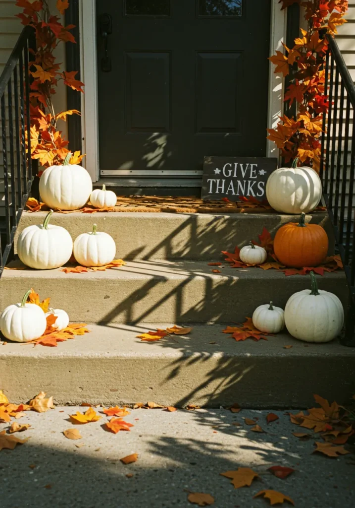 This charming entryway keeps it simple but heartfelt. The steps are scattered with white and orange pumpkins, surrounded by fallen leaves and a “Give Thanks” sign that ties it all together. It’s cozy, classic, and radiates Thanksgiving spirit in the sweetest way.