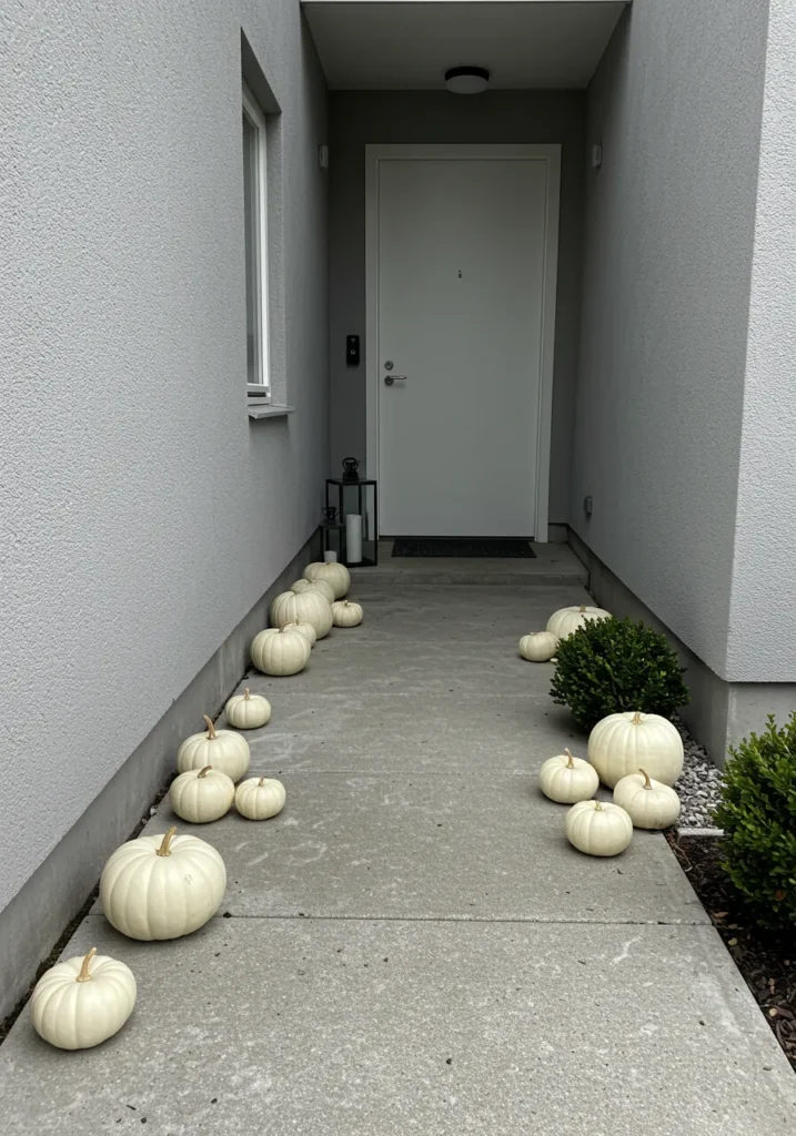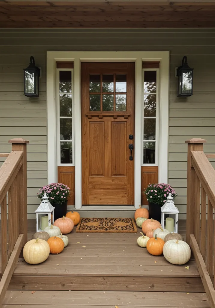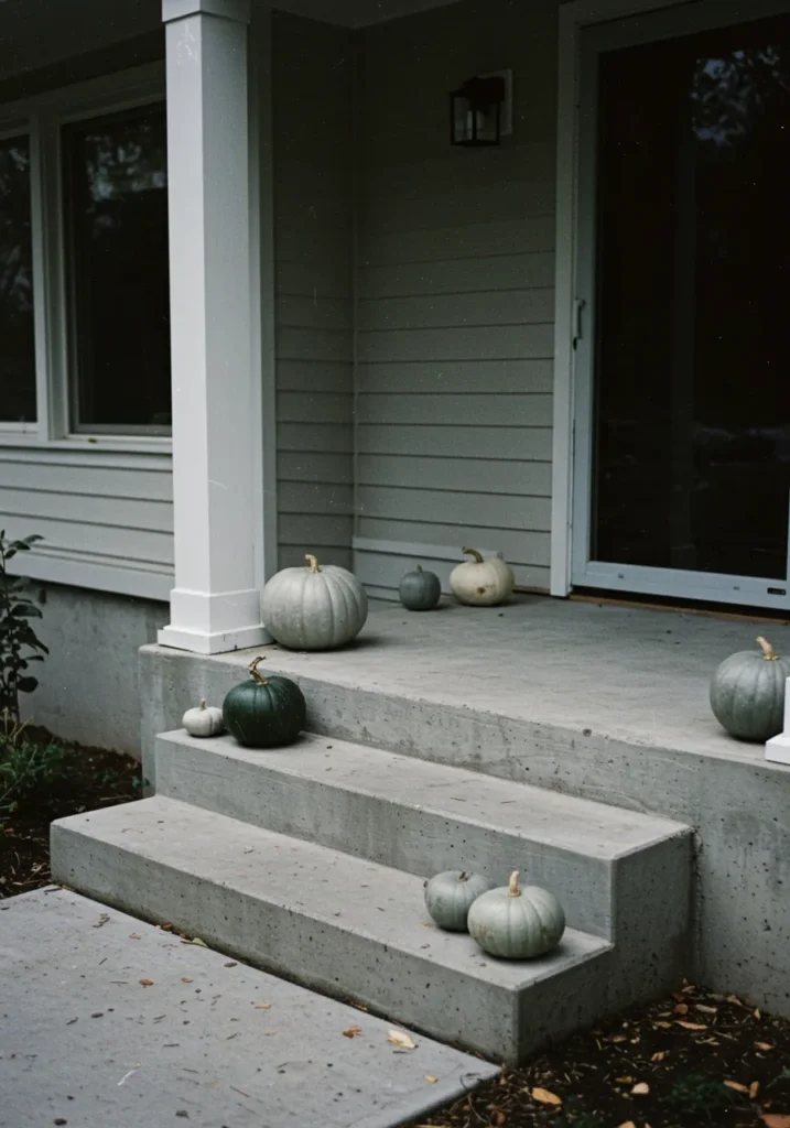 This minimalist porch proves that less can be stunning. Cool gray steps and a muted house exterior set the perfect backdrop for a few carefully placed pumpkins in sage green and off-white tones. The simplicity makes each pumpkin pop, creating a clean, modern look that still feels festive.