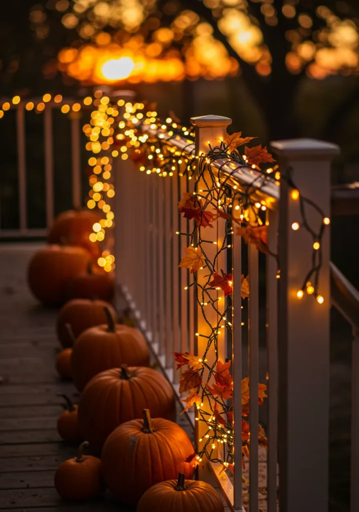 Soft golden lights wind around the porch railing, paired with plump pumpkins resting in a neat line. The sunset glow in the background makes the whole setup feel like a cozy autumn dream. The warm twinkle of fairy lights mixed with orange leaves creates that perfect “golden hour” Thanksgiving moment right outside your door.