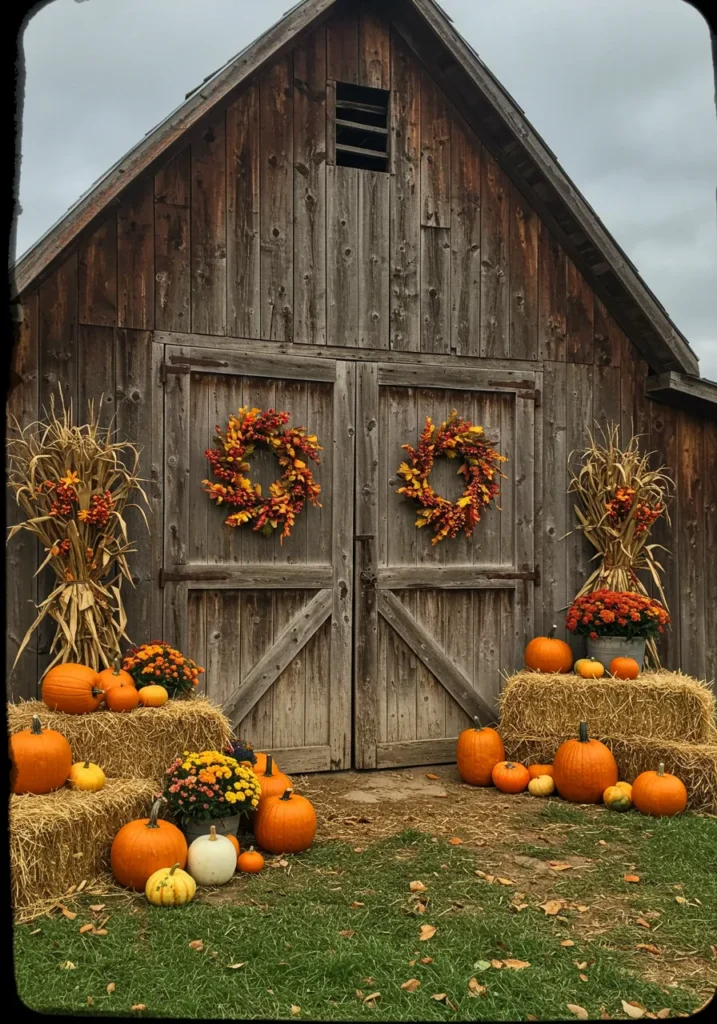This rustic wooden barn entrance is bursting with autumn character. Hay bales and burlap sacks filled with pumpkins lead the way, framed by soft wood tones and colorful mums. The glow from the light inside adds a welcoming touch, like you’re about to step into a cozy farmhouse kitchen full of the smell of apple pie.