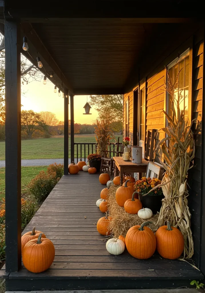 Here’s a porch that practically glows with fall happiness. Pumpkins in every size sit alongside hay bales and rustic decor, all bathed in the soft orange light of a setting sun. The black wood siding and string lights add a moody touch that makes the whole scene feel peaceful and nostalgic.