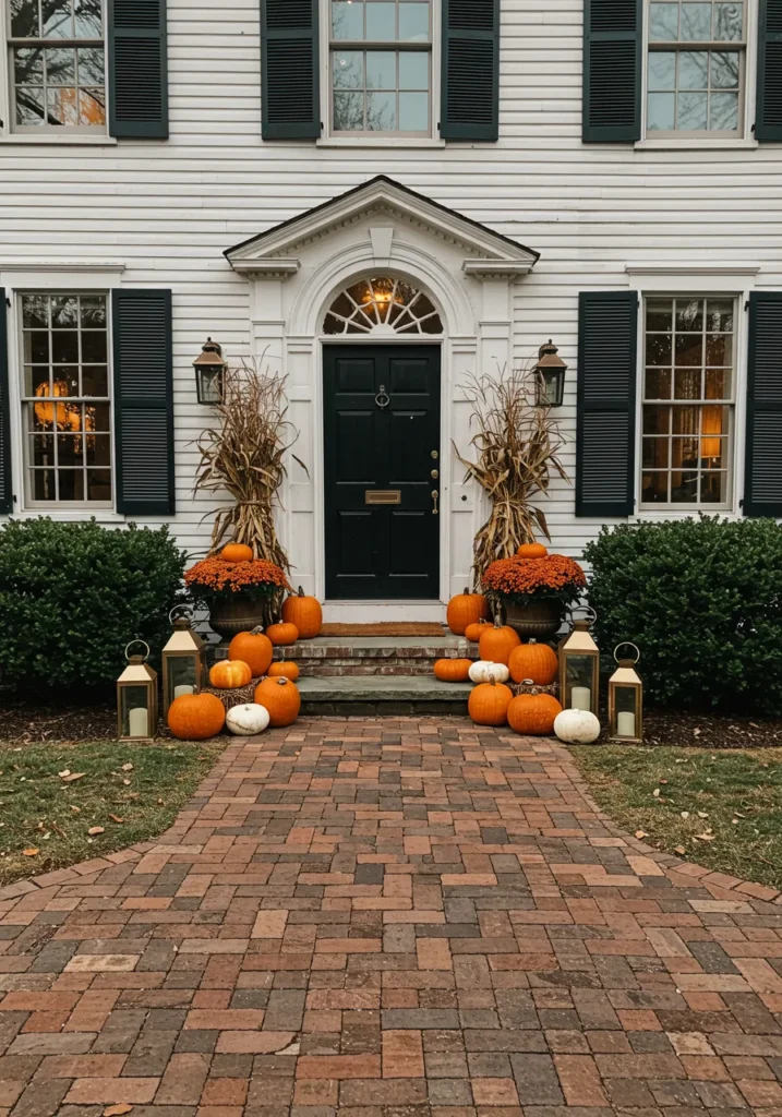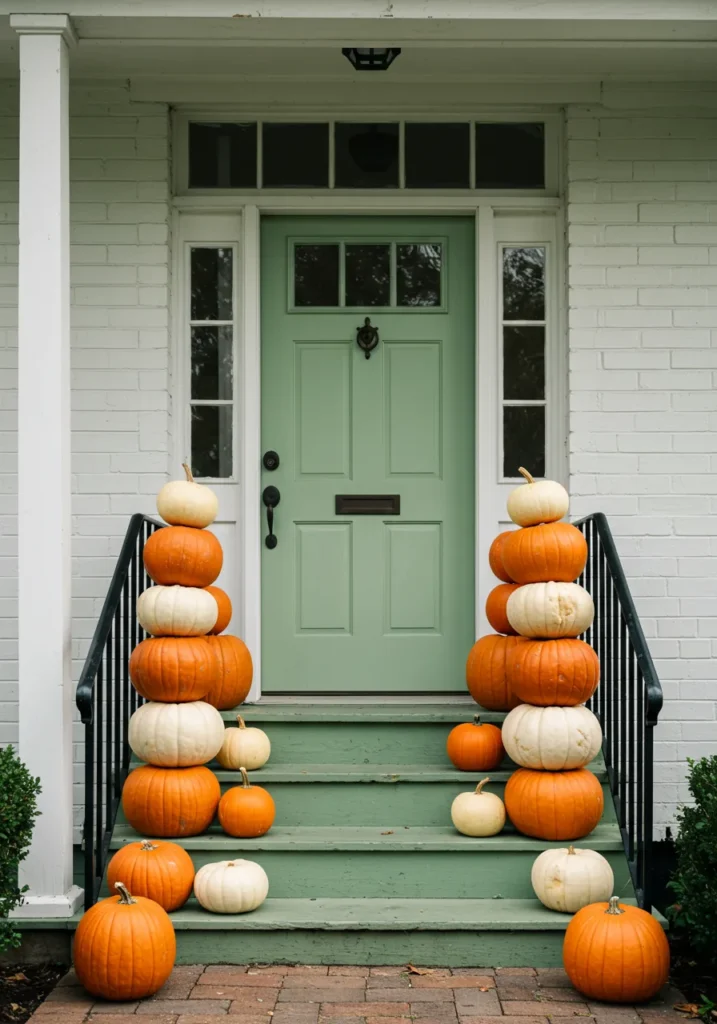 If you like a little order with your autumn flair, this stacked pumpkin entryway is pure perfection. Crisp white bricks, a mint-green door, and two symmetrical towers of orange and white pumpkins make for a modern yet playful display. It’s polished but still feels friendly and festive.