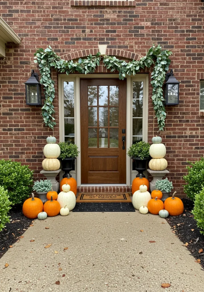 This clean and structured entryway mixes traditional brick with modern flair. The stacked pumpkins in shades of white, cream, and orange create perfect symmetry, while the fresh greenery and eucalyptus garland soften the sharp lines of the home. The overall look feels balanced, elegant, and ready to impress every Thanksgiving guest.