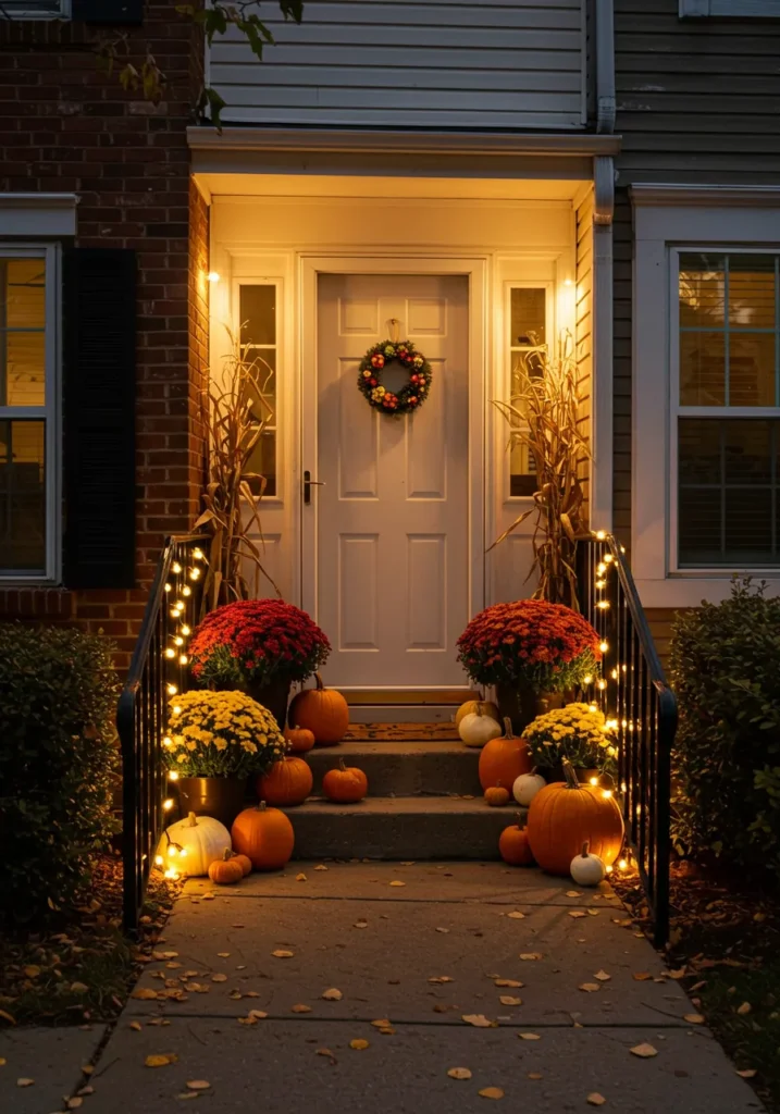 This front porch practically sparkles at dusk. The golden lights wrapping the railings, the clusters of mums, and the pumpkins nestled along the steps create a warm, glowing welcome. Corn stalks frame the doorway for that final rustic touch, pulling the whole cozy look together.