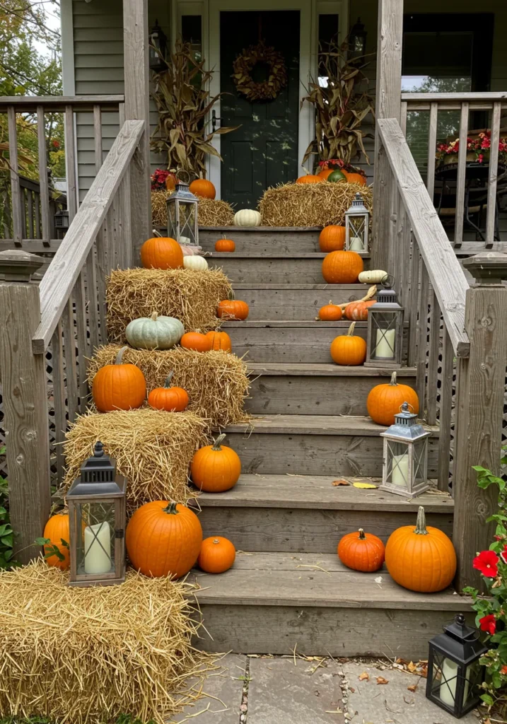 These wooden steps turn into a mini harvest festival. Layers of straw bales, pumpkins in all shapes and colors, and lanterns with candles make every step look charming. The mix of textures—rough hay, smooth pumpkins, and shiny lanterns—feels perfectly festive without being too fussy.