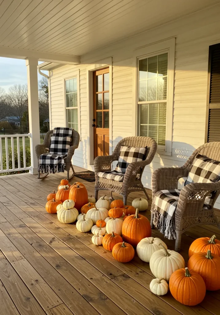 This warm farmhouse porch looks like the perfect spot to sip coffee on a crisp fall morning. A mix of orange and white pumpkins fills the space with cheerful autumn color, while plaid blankets draped over wicker chairs add that cozy touch everyone loves this time of year. The natural wood tones and sunlight give it all a calm, country feel that’s straight out of a magazine.