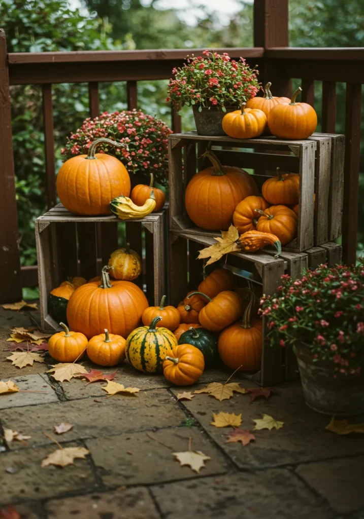 Cottage Deck With Pumpkin Crates and Garden Blooms