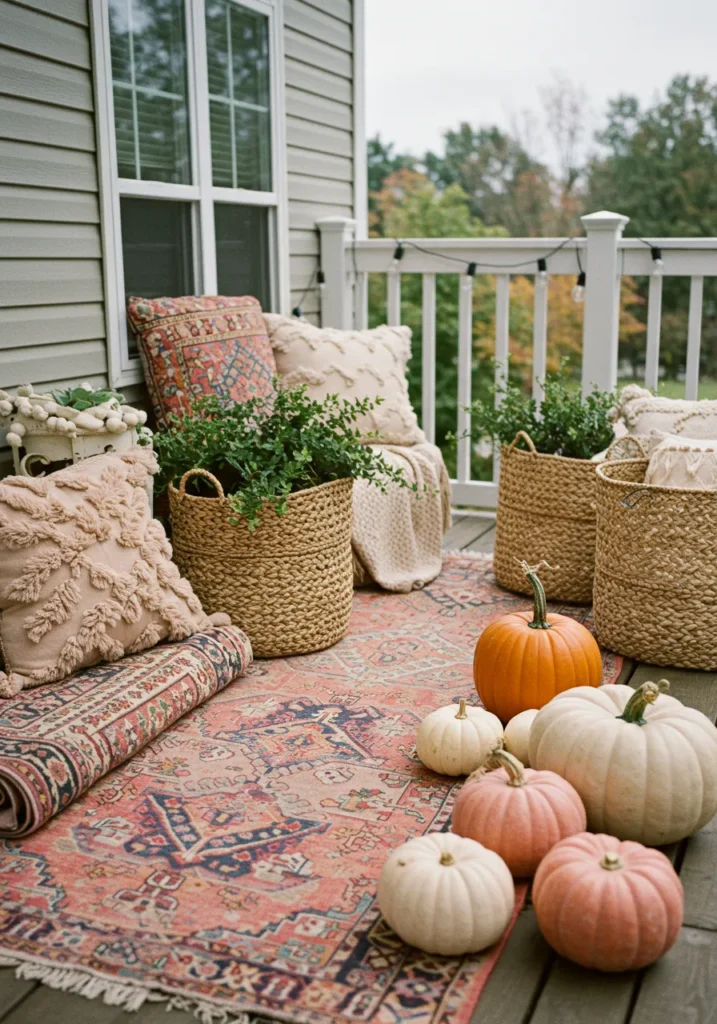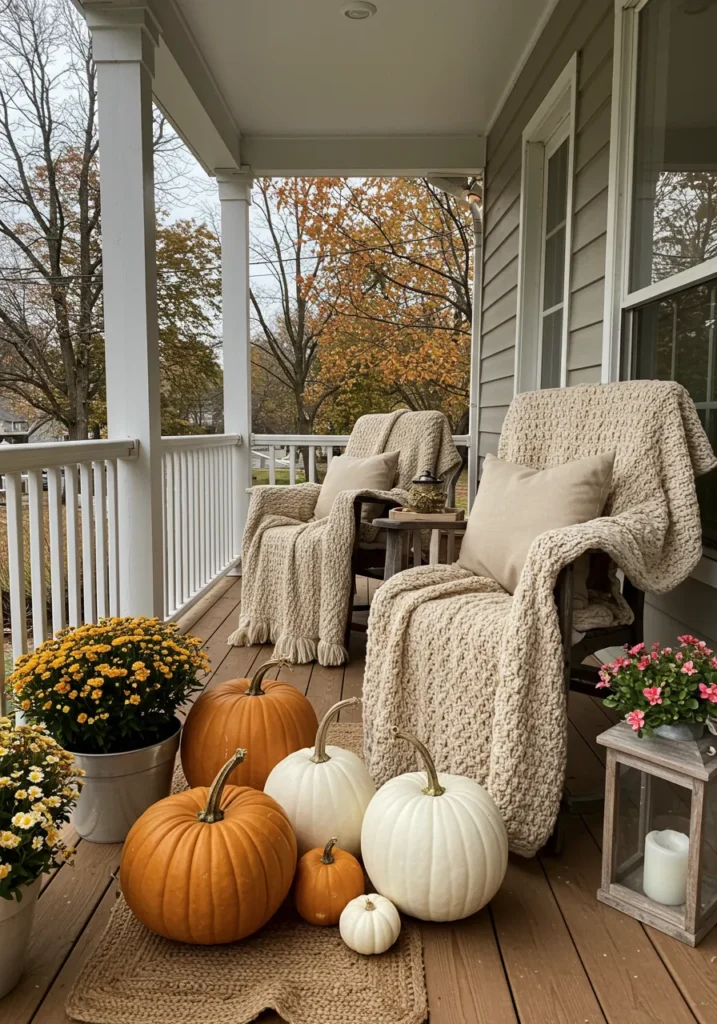 Cozy Porch Retreat With Plush Throws and Pumpkins