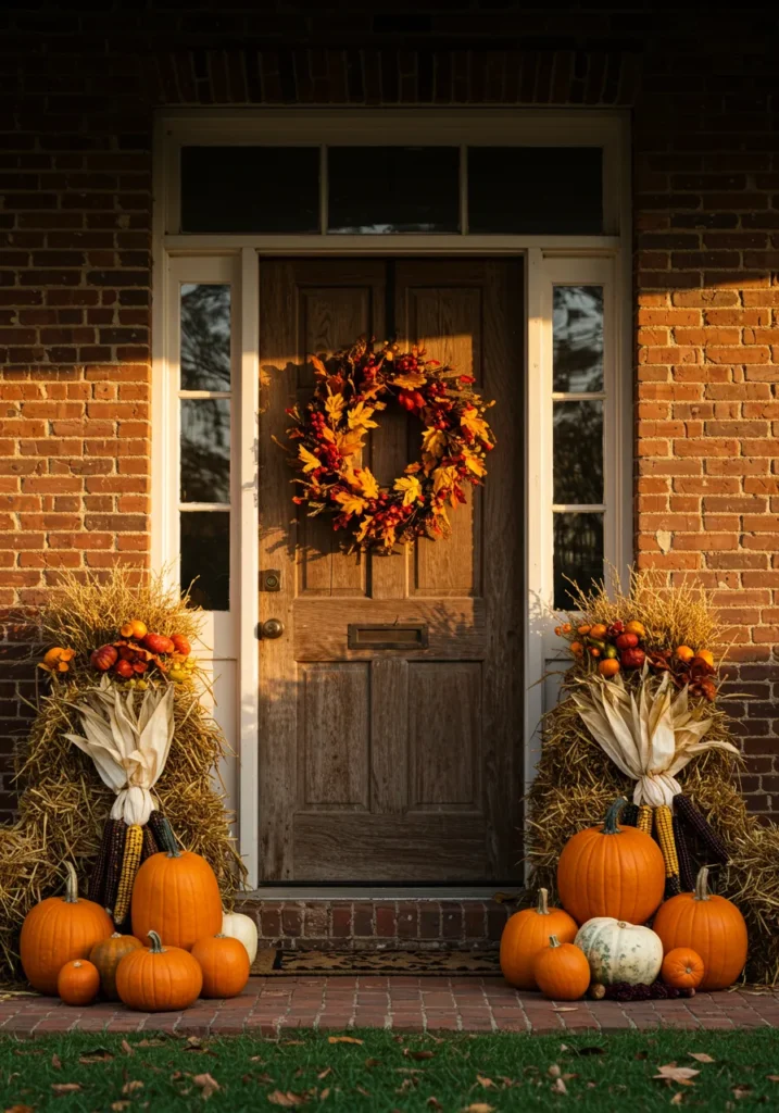 This cozy brick doorway is the kind of scene that makes fall decorating feel effortless. The warm brick, weathered wooden door, and a golden-hour glow create such a timeless Thanksgiving welcome. A wreath bursting with autumn leaves sets the tone, while bales of hay and bright orange pumpkins gather neatly at the base, making the whole setup feel like a cheerful harvest greeting right on your doorstep.