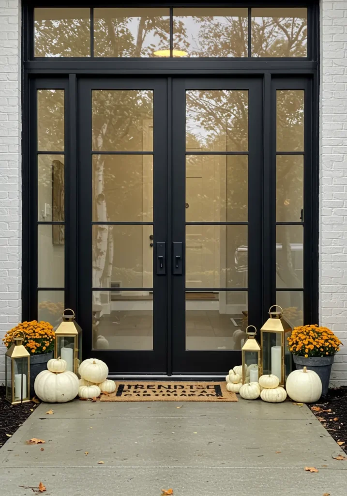 This modern doorway feels so refined yet festive. The matte black double doors make the perfect backdrop for the clusters of white pumpkins, gold lanterns, and bright mums. Everything feels balanced and clean, with just the right amount of warmth from the metallic accents.