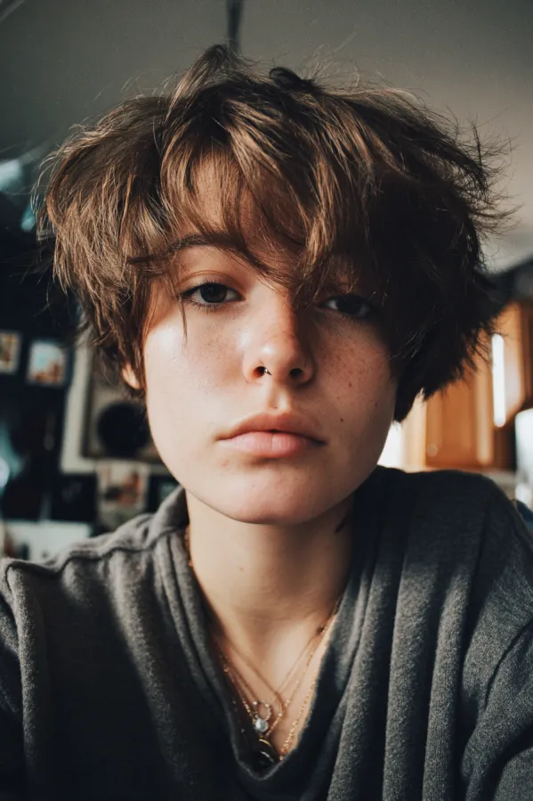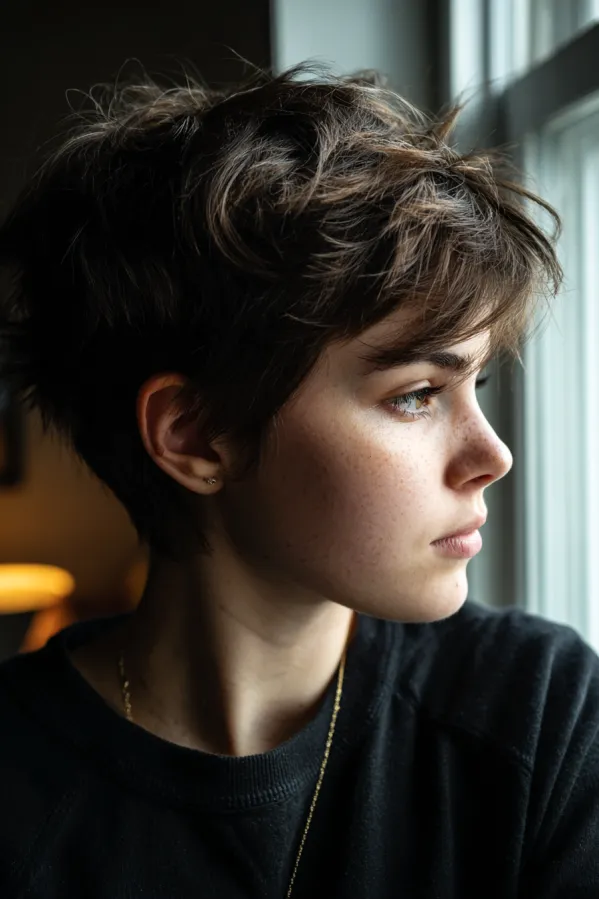 This tomboy hairstyle features a short crop with lots of soft, messy layers that build natural volume and movement. The warm brown tone adds depth, while the longer fringe falls loosely across the forehead for a relaxed and slightly undone look.
