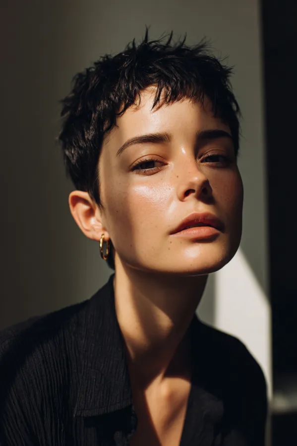 This tomboy hairstyle features an ultra short crop with soft, piecey layers that add subtle texture across the top. The deep brunette color keeps it sleek, while the slightly uneven fringe gives it a modern and effortless edge.