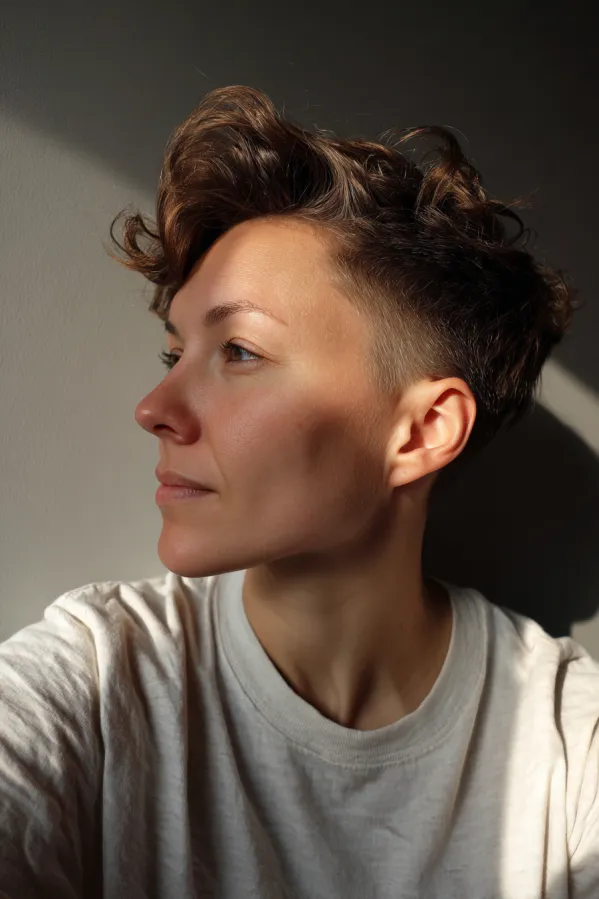 This tomboy hairstyle features a short undercut with closely trimmed sides and a longer top full of soft curls and volume. The rich brown color adds depth, while the lifted front creates a bold and sculpted shape that stands out.