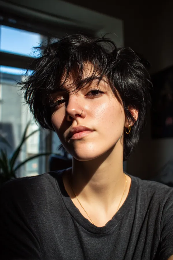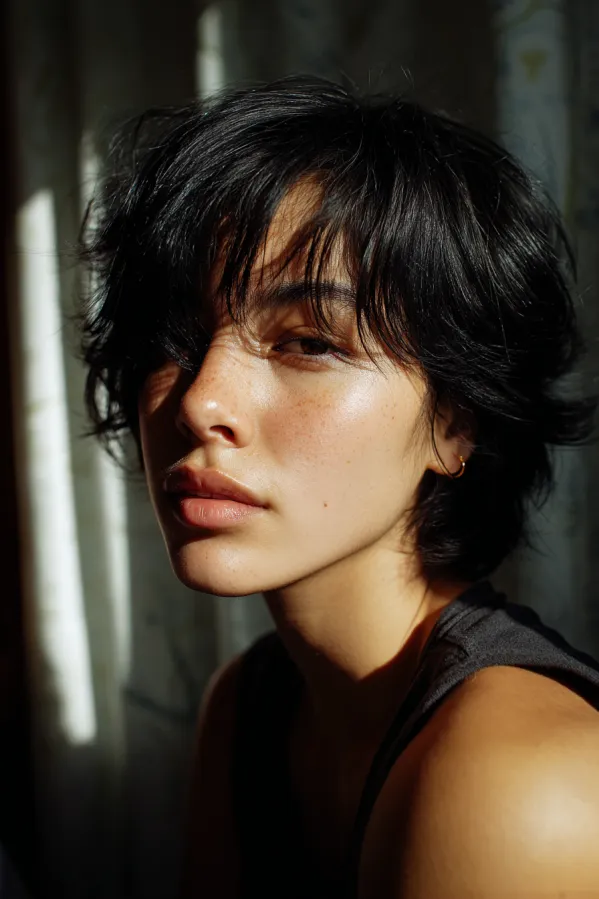 This tomboy hairstyle features a short pixie cut with tousled layers and a slightly longer fringe that falls naturally across the forehead. The deep black color gives it a sleek edge, while the messy texture adds movement and a relaxed finish.