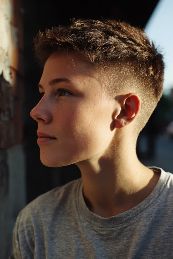 This tomboy hairstyle features a short tapered cut with closely faded sides and a slightly longer textured top. The natural brown tone keeps it simple and fresh, while the soft layering on top adds just enough movement without feeling overstyled.