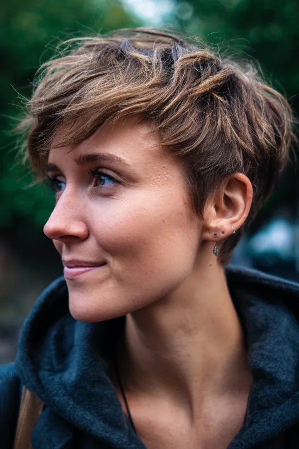 This tomboy hairstyle features a short pixie cut with soft, textured layers that add natural movement and lift. The light brown base is brightened with subtle blonde highlights, giving the hair a fresh and dimensional look.