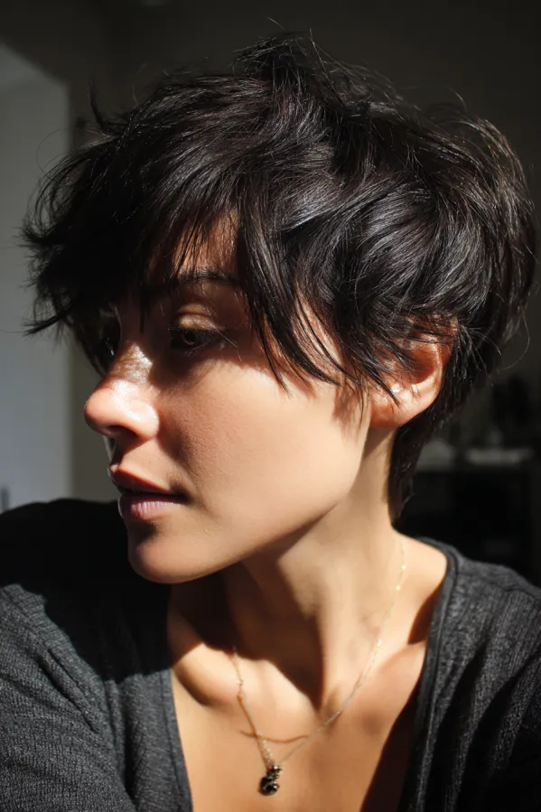 This tomboy hairstyle features a short pixie cut with choppy layers that create natural volume and movement. The deep dark tone keeps it sleek, while the slightly longer top and soft fringe add a relaxed and textured finish.