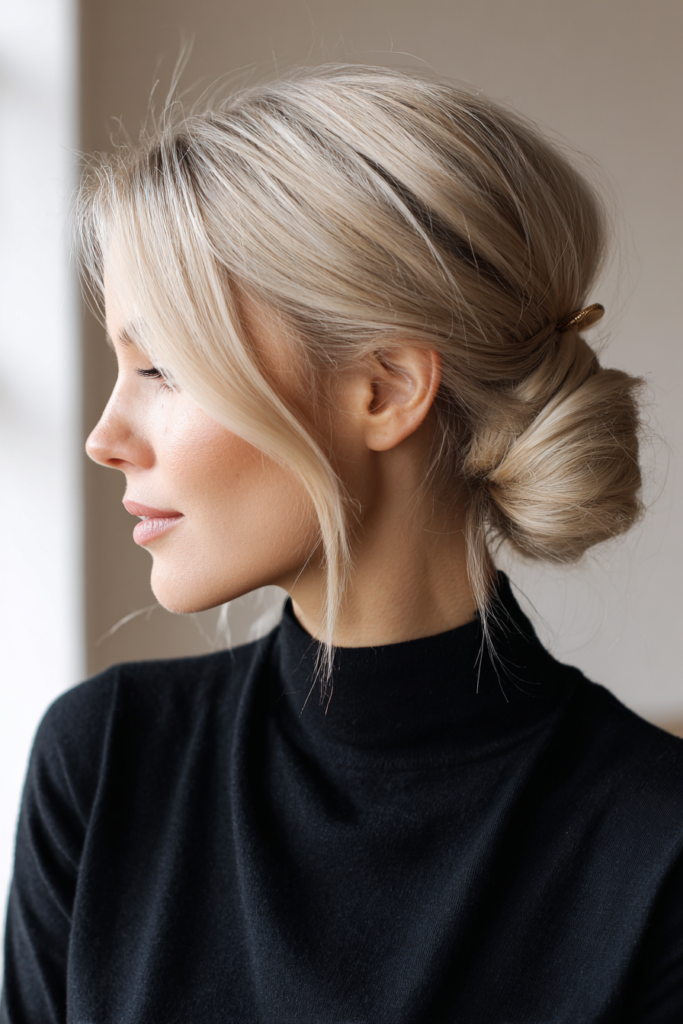 A woman with ash blonde hair from behind shows a sleek and polished French twist secured with a small gold claw clip.