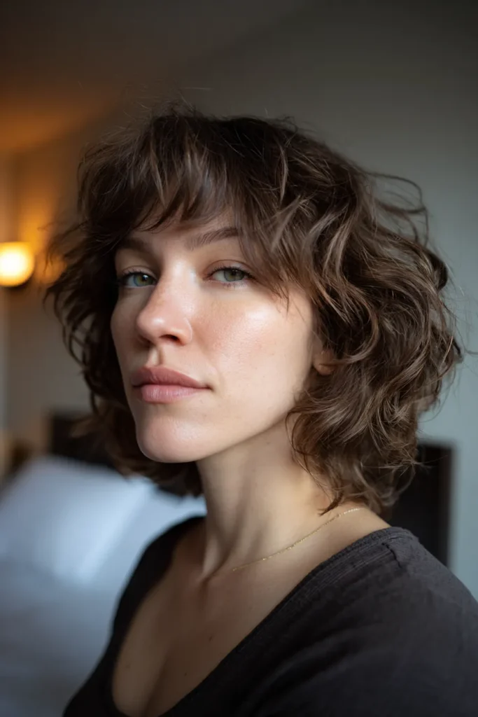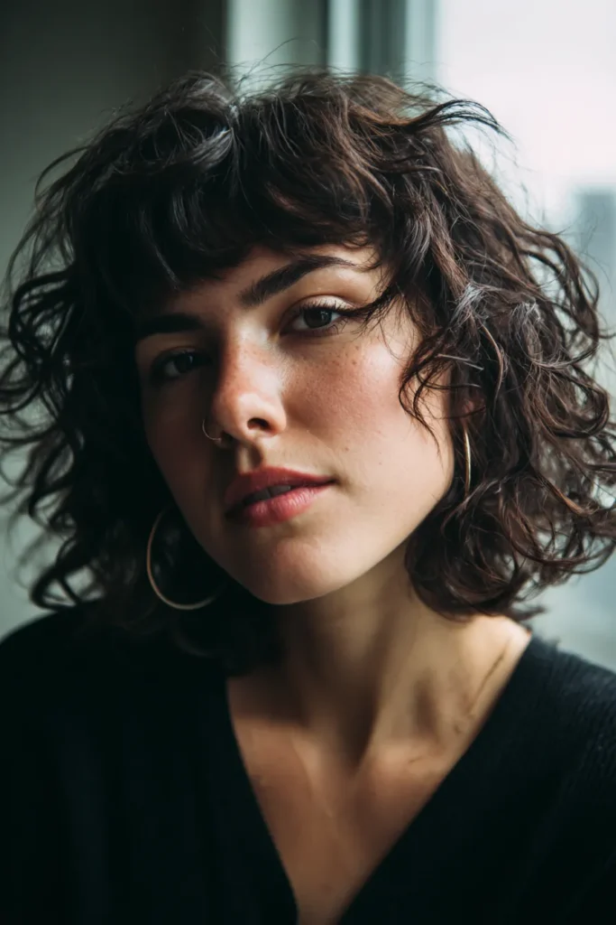 This look showcases a chin-length bob full of bouncy and organic texture. The deep chocolate brown color adds a lot of richness, while the choppy layers create a playful volume that keeps the curls from feeling too heavy. A thick set of curly bangs rests just above the eyebrows, which highlights the eyes and gives the whole style a cool vintage vibe. It is the perfect balance of effortless and intentional.