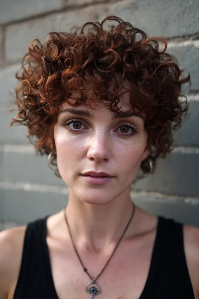 This fiery style is a total celebration of tight natural texture and vibrant color. The cut is shaped into a rounded silhouette that sits right around the ears, while plenty of short layers throughout the top give those copper ringlets amazing lift and height. It features a full set of curly bangs that graze the eyebrows, which really makes the eyes pop against the warm reddish tones. The overall look is bouncy and full of life, which proves that short hair never has to mean sacrificing volume.