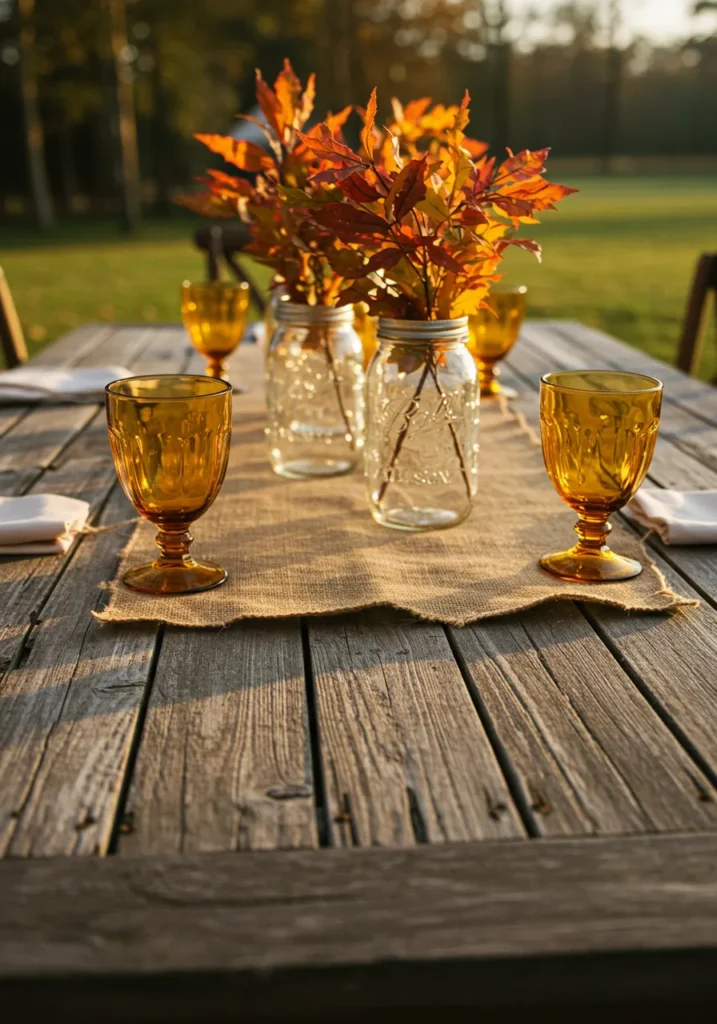 A weathered wooden table is dressed with a simple burlap runner, mason jars holding golden autumn leaves, and amber glass goblets that sparkle in the sunlight. The mix of textures feels casual yet elegant, perfect for outdoor dining.