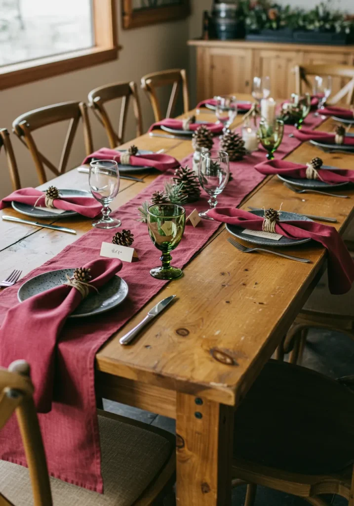This setup feels so festive to me. The red instantly brings in a holiday mood, and the pinecones keep it grounded in nature, making it perfect for a family gathering.