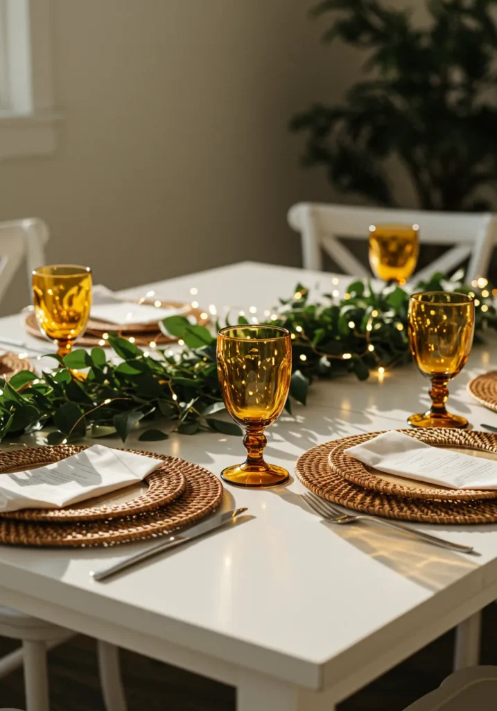 This white table is set with woven chargers, amber goblets, and a garland of fresh greenery twinkling with fairy lights. The combination of natural textures and warm tones makes the space feel magical.