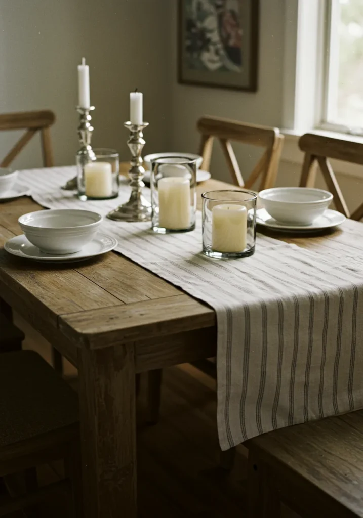 A rustic wooden table features a striped runner topped with pillar and taper candles in silver holders. Simple white dishes keep the look timeless and easy to recreate.