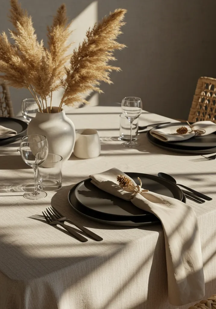 A cream tablecloth sets the base for a sleek setup with black plates, soft linen napkins, and a centerpiece of pampas grass in a white vase. The earthy tones feel natural yet modern.