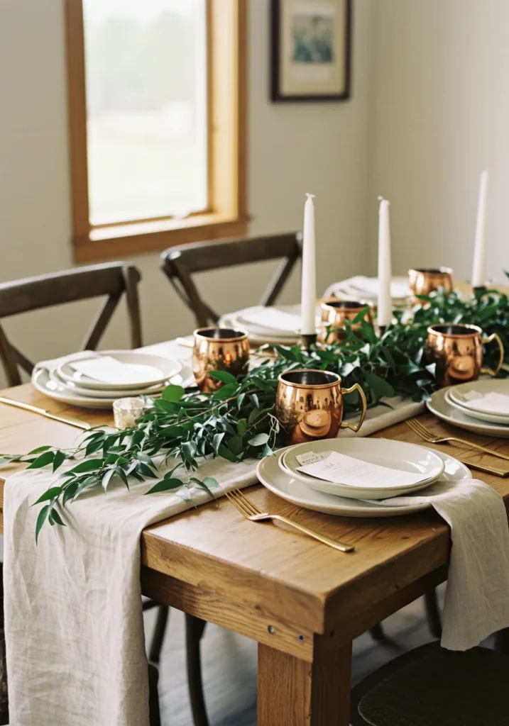A simple linen runner sets the stage for a centerpiece of lush greenery that flows down the middle of the table. Copper mugs add warmth and shine while white plates and gold flatware keep the setting refined.
