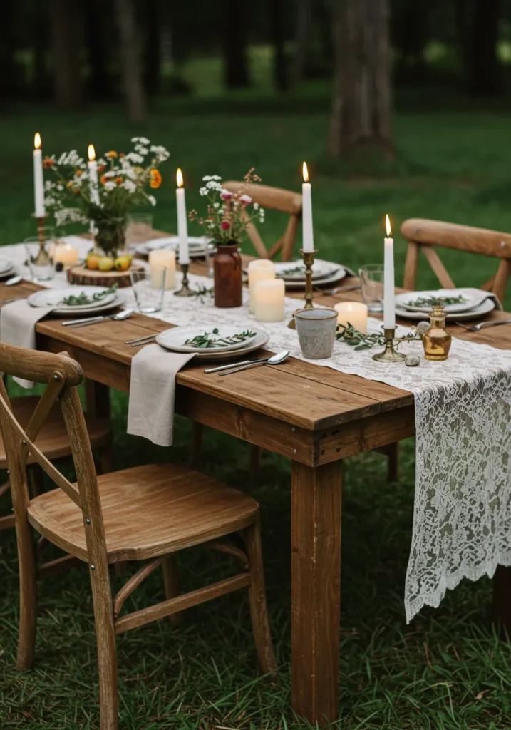 Set outdoors, this wooden table features a delicate lace runner topped with tall candlesticks, rustic jars filled with wildflowers, and glowing pillar candles. Each plate is styled with a small sprig of greenery for a natural touch.